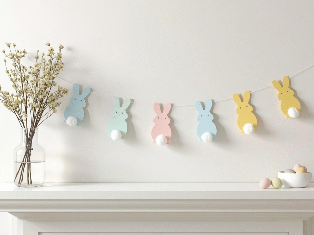 Cut bunny shapes from pastel cardstock. Punch holes and string on twine. Add cotton balls for tails. This is a fast holiday decor diy that kids can help with.