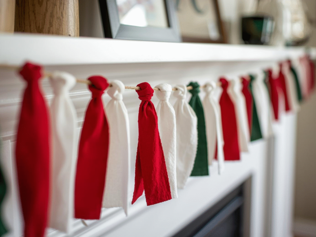 Cut strips from leftover cotton or felt. Tie the strips to twine. Use green, white, and red for Christmas. Swap to pastels for Easter later. You get cheap holiday decor that works across seasons.