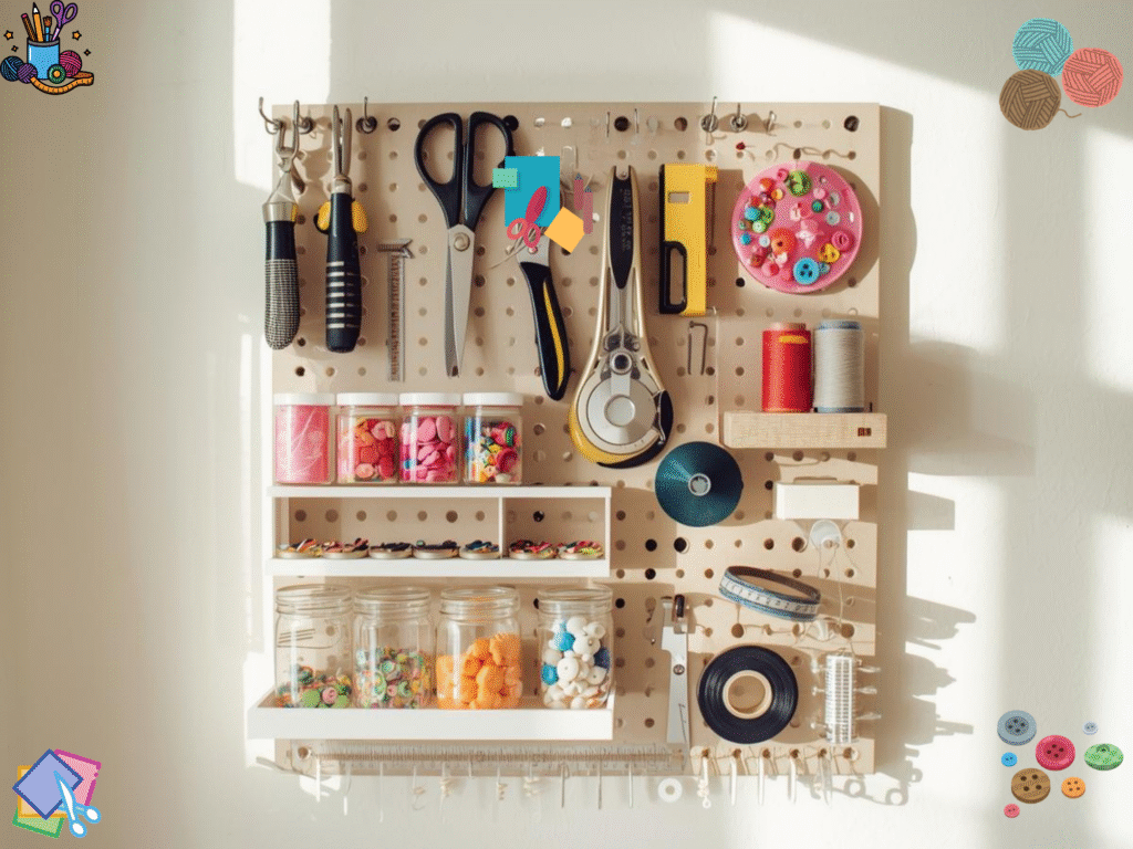 Pegboards are a small space hero. They lift tools off your table and onto the wall. Hooks hold scissors, rulers, and rotary cutters. Small shelves hold thread, jars, and tapes. You can move parts around as your projects change. IKEA’s SKÅDIS system shows many ways to set up a pegboard for crafts and tiny rooms, including baskets and shelves that clip on in seconds.