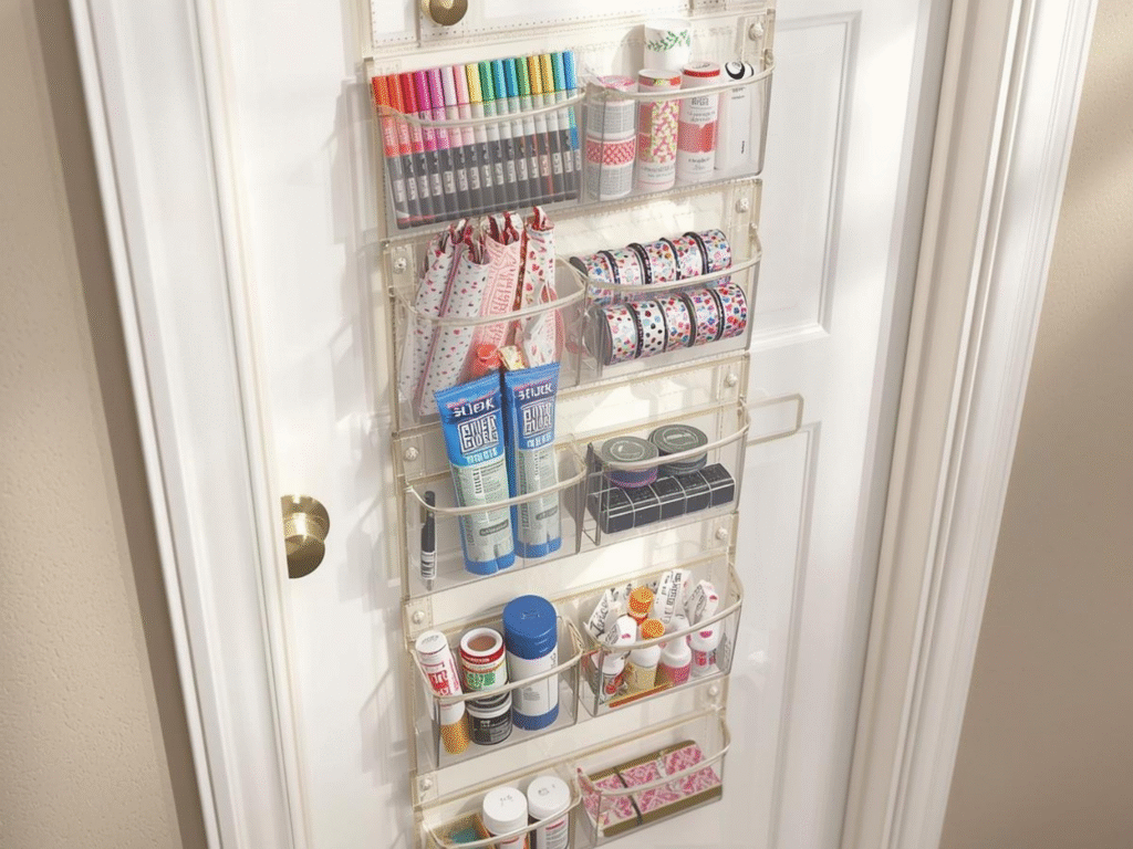 An over the door shoe organizer is a low cost way to store lots of small supplies. Each clear pocket holds markers, glue sticks, washi tape, trims, small paints, or stamp pads. You can see everything and grab what you need. Better Homes & Gardens and other organizers call this a perfect fix for craft supplies because the pockets keep items upright and tidy.