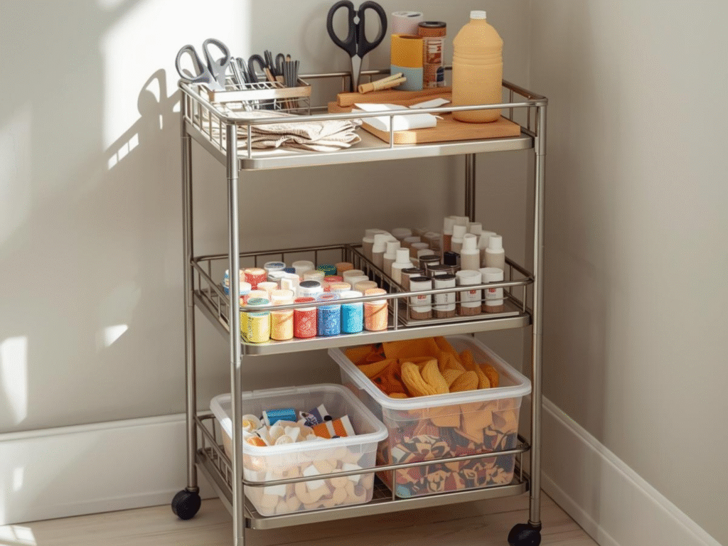 A three tier cart acts like a mini mobile studio. Top shelf for tools you grab all the time. Middle shelf for paints, threads, or a small project box. Bottom shelf for extra paper, fabric scraps, or a glue gun caddy. When you are done, roll it into a closet or corner. Rolling carts are a classic in craft storage ideas and fit well in a small apartment setup because they move and hide fast. The Spruce lists carts and open caddies as easy ways to add flexible storage to tiny craft zones.