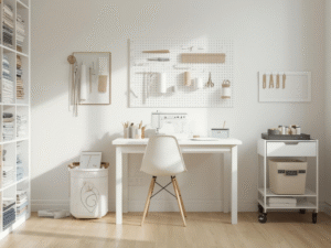 This layout uses organization ideas for small spaces that you can build in steps. Start with the wall and door. Add the cart when you can. Keep the work surface clear so you can sit and sew right away.