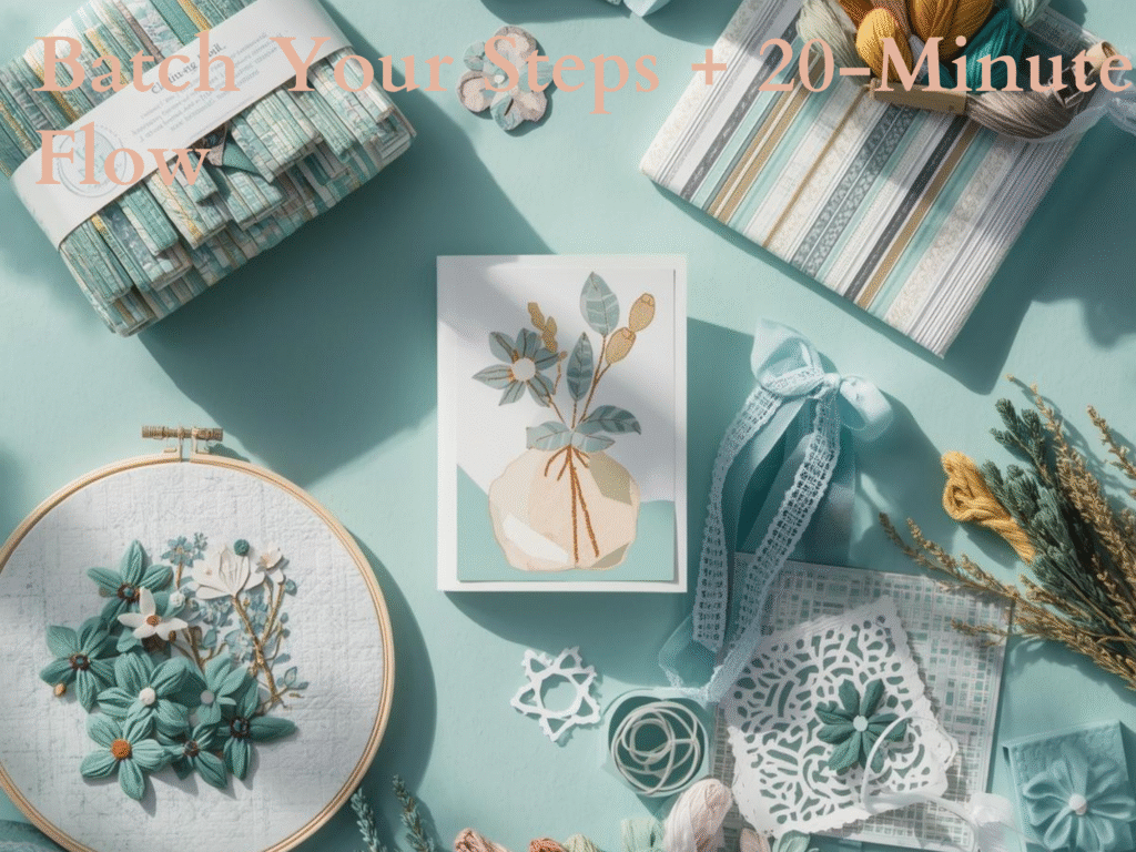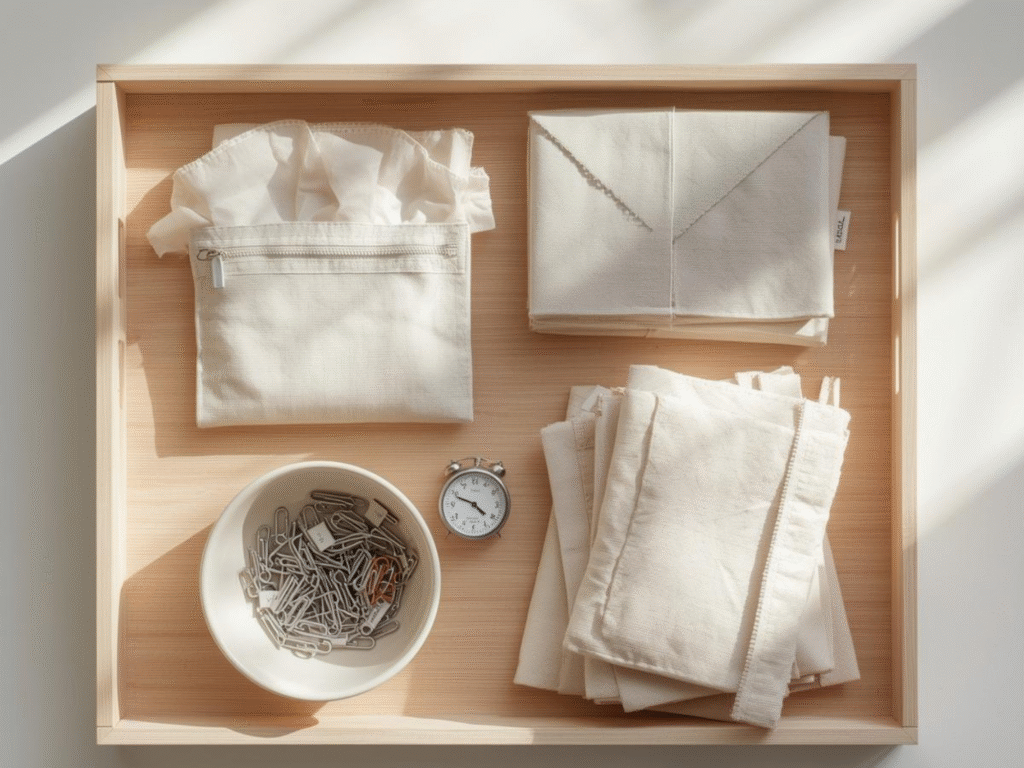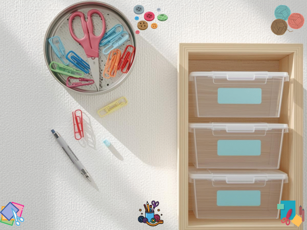 A clear space saves minutes on every project. Put the things you use most within one arm’s reach. I like a small tray for scissors, clips, seam ripper, and a fabric marker. Use labels so you can see where things go at a glance. If you need help, grab our free planner: Craft Time Goal Planner. It helps you block short sessions and protect your craft time.
