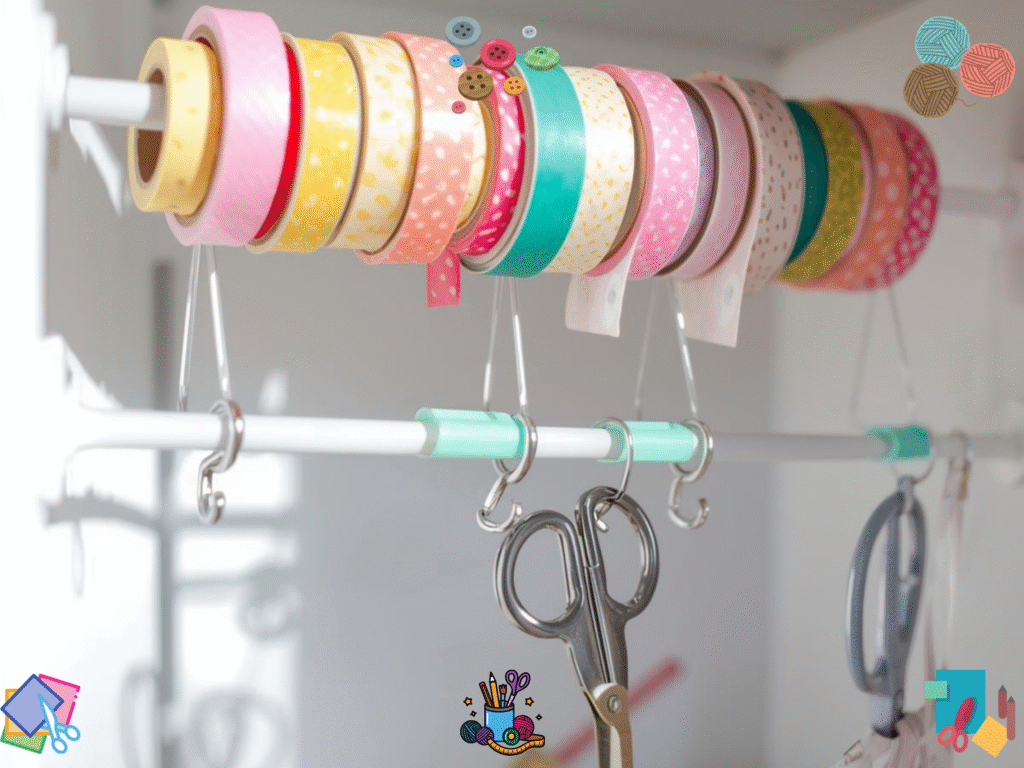 Why it works: Tension rods are cheap and fit inside cabinets, shelves, or a small bookcase. You can slide washi rolls and ribbons right on the rod.