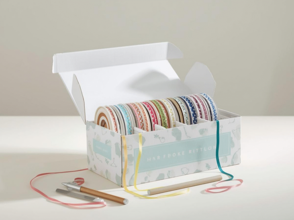 Why it works: A simple box keeps ribbon neat and easy to pull. You can see colors at a glance and cut without the rolls rolling away.