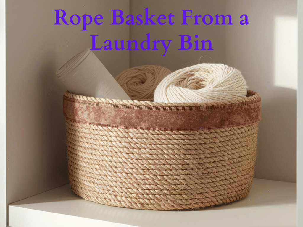 You need: Small plastic bin, rope, hot glue, ribbon for trim.