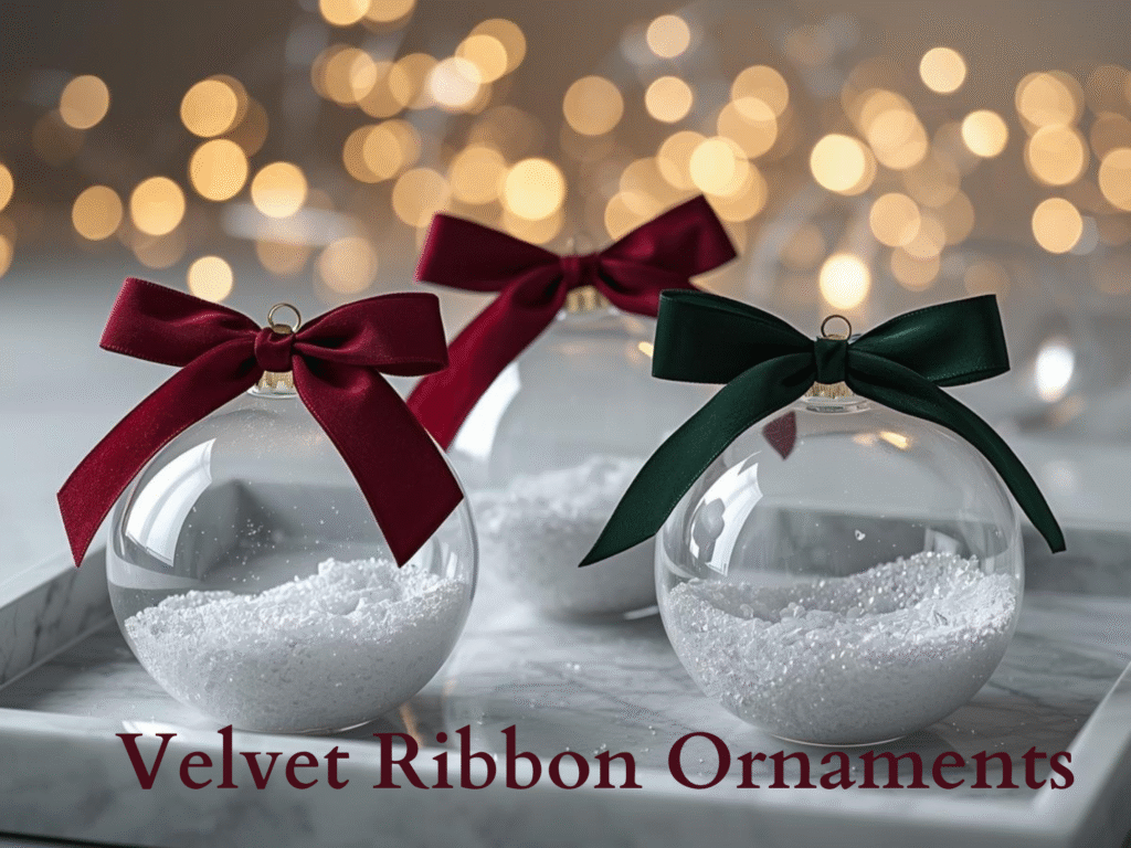 You need: Clear plastic ornaments, velvet ribbon, faux snow or glitter.