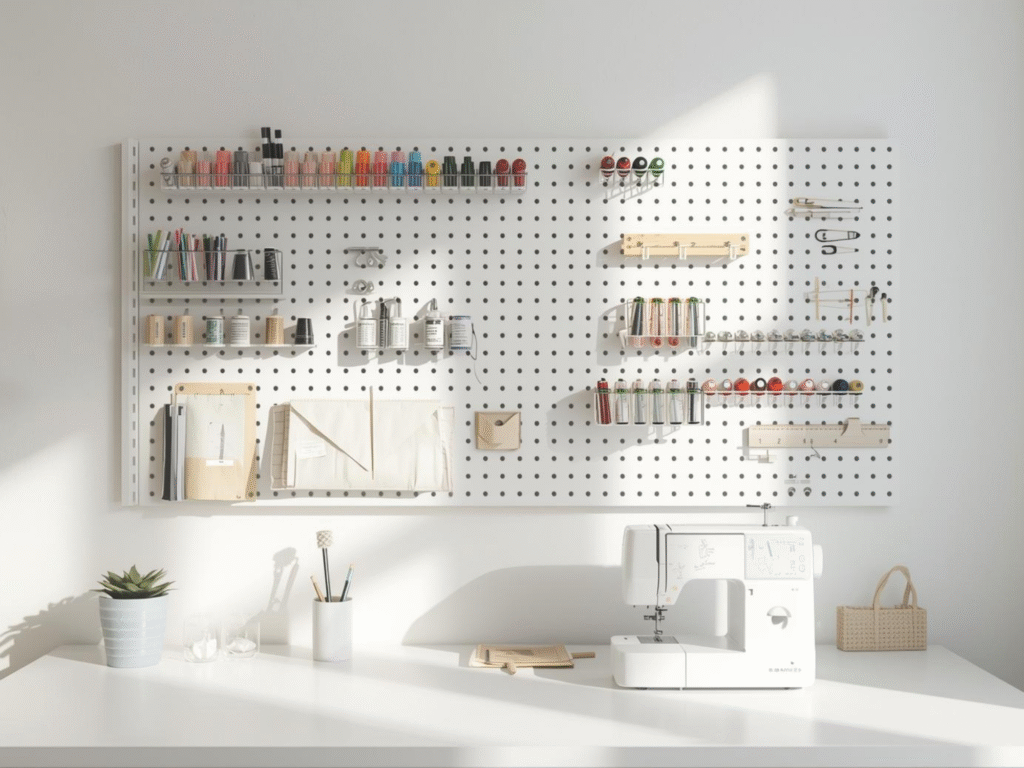 The SKÅDIS pegboard system turns a blank wall into organized storage. Use cups for markers, small shelves for thread, and elastic cords for patterns and rulers. I mount one board above the machine and one near the cutting area. Keep only daily tools on the wall. Rotate the rest into drawers or bins to prevent clutter creep. See boards and accessories in the SKÅDIS series and pegboard listings to plan your layout.