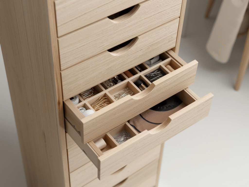 Small items need shallow drawers so they do not get lost. The ALEX drawer units are perfect for thread, vinyl, paper, needles, and snaps. The 9 drawer tower fits in tight spaces and gives you many thin layers. Add dividers for bobbins and feet. Label each drawer by task so you can reset the room in minutes after a project. Explore the ALEX series and the 9 drawer unit details to see sizes and options.
