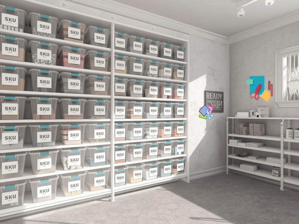 Your products need a real home. Use sturdy shelves with clear bins, or banker boxes with large labels. Give each product a simple SKU and a location code, like “A-3-Bin2.” Put your top sellers on the middle shelves so you can pick them fast. Add a “Ready to Ship” shelf just for finished items that are waiting for labels.