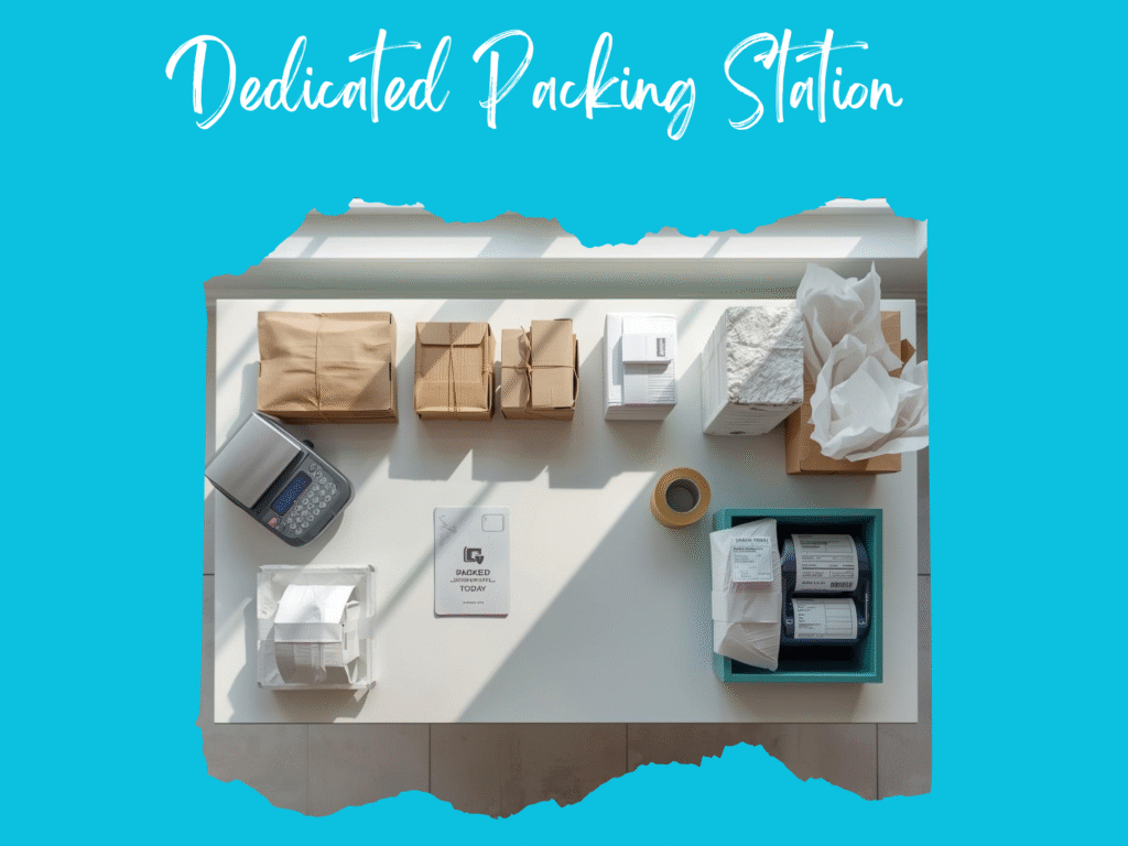 Packing is where many small shops lose time. Give it its own table if you can. Keep it clean and set up the same way every day. Here is a simple layout, left to right: